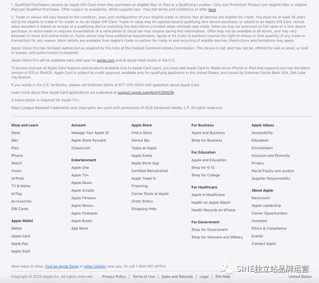 法律术语页脚包含网站访问者在滚动浏览你的网站时应了解的相关法律信息。苹果公司的页脚就是一个典型的例子,它的段落是法律脚注的段落。
