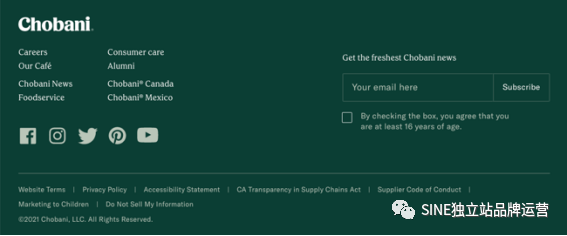 例如,Chobani在其页脚中包含一个简单的电子邮件选择加入表单。上面的标语——“Get the freshest Chobani news”——有助于设定订阅者对他们订阅的内容的期望。