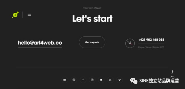 Art4web是一家创意数字和品牌工作室,致力于制作独特的网站、APP程序和品牌设计。它自己的页脚部分是独特设计的一个例子。Art4web不像Spline Group 那样向潜在客户提供一个CTA链接,而是提供了三个CTA链接。潜在客户可以向他们发送电子邮件、填写表格以获取其项目的报价,或者给他们打电话。或者他们可以选择在下方图标代表的任何社交媒体平台上进行连接。