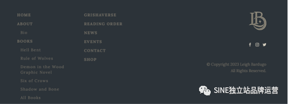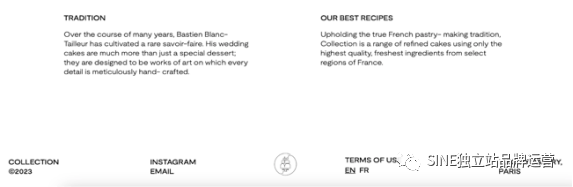 如果你的网站特别艺术化,或者你有一个单页网站,则可能不需要页脚。(尽管你应该始终包含版权信息和使用条款,如上例所示。)放弃页脚可能会保留你网站的美感,但对于大多数品牌和公司来说,拥有页脚是最好的。