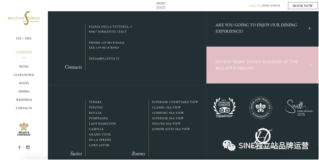豪华精品酒店Bellevue Syrene在其网站页脚网格中专门展示了其联系信息。为确保潜在客人可以按照自己想要的方式联系酒店,页脚包含地址、电话号码、传真号码和电子邮件地址。