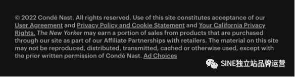 最佳做法是在网站页脚中放置指向隐私政策的链接。这不仅能满足法律要求,还能满足大多数消费者的期望,因为他们希望在页脚中找到此信息。像Conde Nast这样的一些公司除了链接之外还会选择包含其隐私政策的摘录。这是《The New Yorker》的一个例子。