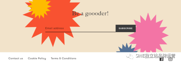 由于gOOOders是一个注重行动的品牌,因此页脚如此注重行动也是有道理的。页脚部分的大部分内容专门用于电子邮件注册表单。该表单的背景色彩缤纷且充满活力,因此你的眼睛会被该部分吸引。下面是一个简单的白行,其中包含版权声明、联系链接、gOOOders的cookie政策和terms and conditions的链接以及社交媒体图标。对于想要优化页脚以实现转化的网站来说,这是一个很好的模型。