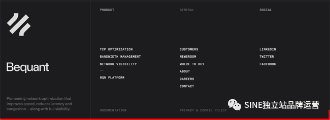 例如,Bequant在页脚的logo正下方添加了其使命宣言。上面写着:“Pioneering network optimization that improves speed, reduces latency and congestion – along with full visibility.” 这样,即使读者没有阅读“关于”页面,他们也会了解该公司的业务。