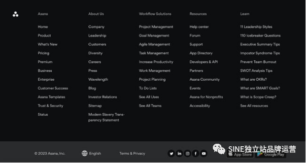 在上面的示例中,Asana包含其自己的公司页面、产品页面、解决方案和资源的链接。它整洁且易于扫描,这就是你在网站页脚中想要的效果。底部是公司条款和隐私页面及其社交资料的典型链接。