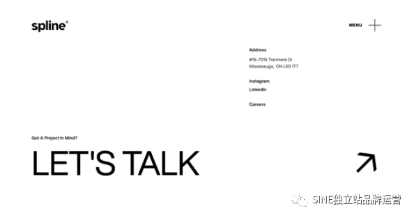 这在其页脚中很清楚。页脚采用简约设计,以白色背景上的黑色文本为特色。有一个地址以及指向其Instagram、LinkedIn 和Careers页面的链接。下面是更大的文本。但与 Superfluid 不同的是,它不是 Spline 的logo或品牌名称。相反,它是一个带有简单但诱人的 CTA 的联系链接:“LET’S TALK”
