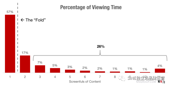 你可能会认为在网站页脚上投入大量时间和精力是没有意义的,因为人们不会注意首屏下方的内容。这种想法得到了大多研究的验证,包括Neilsen Norman Group在2018年进行的最后一项重大研究。他们发现57%的页面浏览时间花在了首屏上。