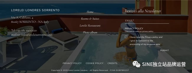 为了预测网站访客提出的任何问题,左侧有联系信息,中间有导航链接,右侧有新闻通讯选择加入表格。右侧还有隐私政策链接以及直接在页脚中的提交表单。下面还有另一个链接,指向隐私政策、cookie 政策、创建该网站的机构以及版权声明。所有这些都放置在图片背景下,该图片背景描绘了某人在俯瞰海滩的阳台上的游泳池中。是标准的页脚,与品牌完美契合。