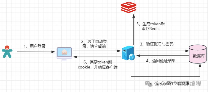 用户勾选“自动登录”选项后进行登录时,服务端验证用户信息通过之后生成一个Token,然后服务端将Token写到Cookie上并存留一段时间,用户下次重新打开浏览器,浏览器会自动登录,如下自动登录的流程图: