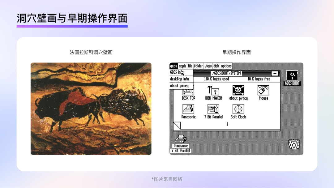 20世纪70-80年代是计算机图形界面的萌芽阶段,就像绘画艺术起源之时的那个茹毛饮血的年代,当时的原始人所能利用的工具只有火堆熄灭后留下的木炭,图像呈现的载体也只有山洞内的墙壁和岩石。就像刚刚进入计算机时代的设计师们,不仅缺少专业的绘图软件,而且当时计算机本身的显示能力也尚且不足。这个阶段的UI设计,能够在显示器上清晰地显示并传达明确的含义,比画出风格更加重要。观察当时的操作界面,不难猜测当时的设计师,努力以具象的表现风格来减少人们对计算机界面的陌生感,但由于工具和载体的限制无法完美实现,虽然这种风格无法被称为拟物风格,但为后来真正的拟物风格的出现和发展奠定了基础。