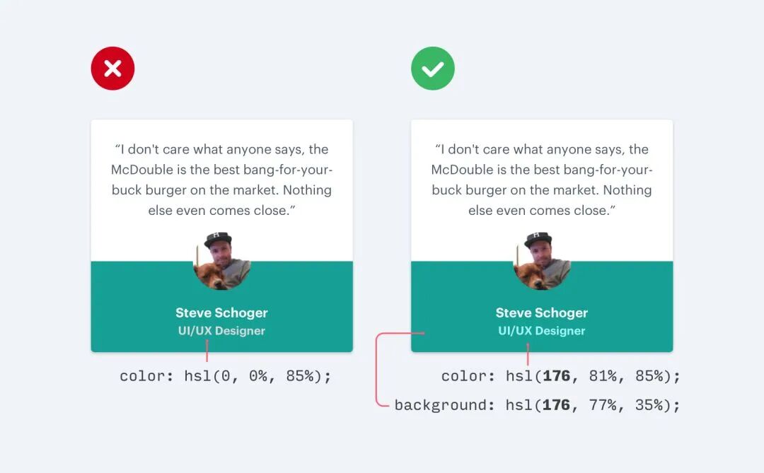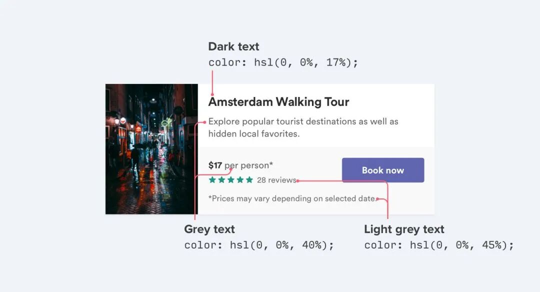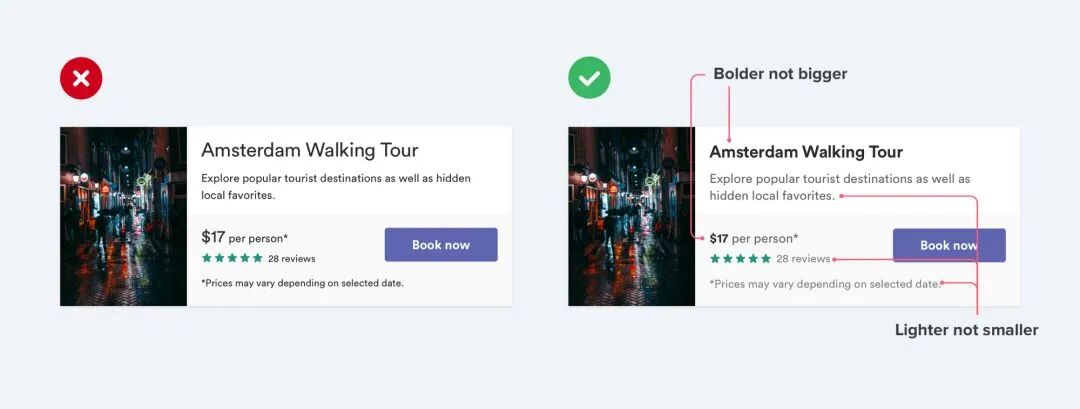 在对UI 文本进行样式控制的时候,最常见的错误莫过于过度依赖字体大小差异来营造对比。单纯使用字体大小对比,所营造的对比并不够,尝试结合色彩和字重来营造更好的对比效果。每种颜色都有一个视觉权重,这有助于在内容中建立层次结构;通过使用颜色的深浅,为元素赋予不同的重要性。如果可以的话,你甚至可以采用两到三种颜色: