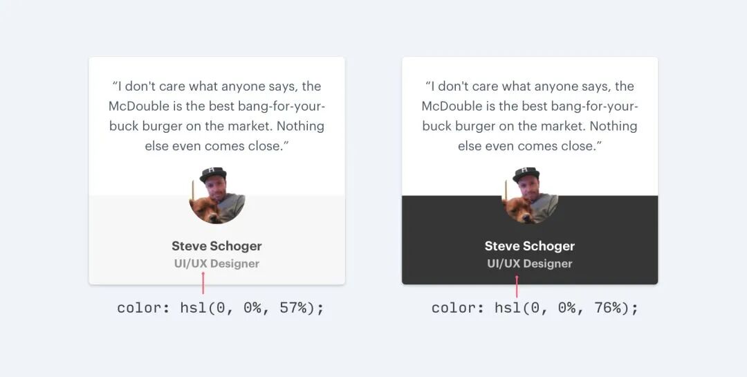 在白色背景下,将黑色的文本改成灰色,是不错的淡化其视觉效果的做法,但是在彩色背景下这么做,则是另外一回事。实际上,让白色背景下文本由黑变灰实际上是达到降低对比度的效果。但是在彩色背景下,想要降低对比度是应该让文本逐步接近背景色,而不是改为灰色。