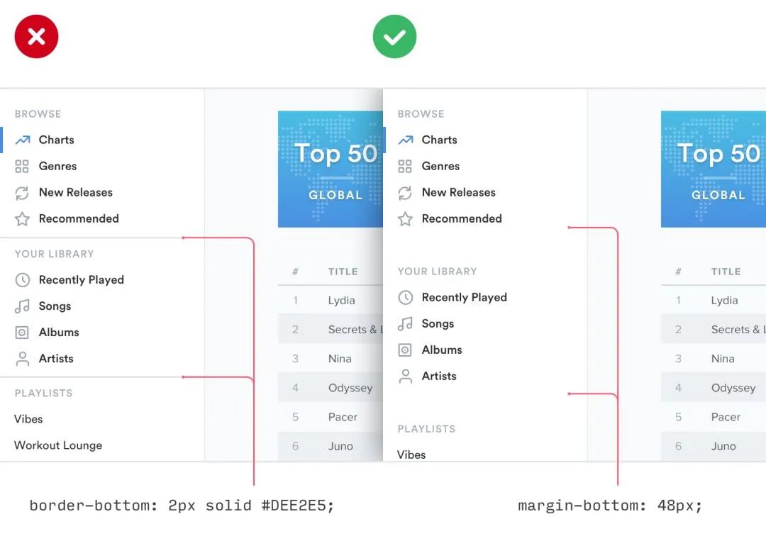 创建元素之间的分离效果,并不一定要通过线框来表现,只要增加留白,让它们分隔开就行了。通过留白和间距来实现元素分组是UI设计中的常用手法。