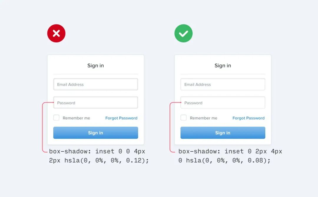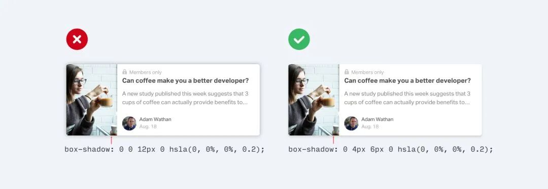 相比于采用大范围的扩散模糊阴影,使用微妙的垂直偏移阴影效果更明显,更自然,它模拟了最常见的光源特征,光线从上往下照下来所营造的阴影效果。这种轻柔的阴影呈现出的干净,增加了画面的精致;如果阴影的范围太小或颜色太深,位置也没有偏移,而是聚集在元素的四周,就会让画面更加扁平,让视觉变得厚重,呈现出不精致的画面感。