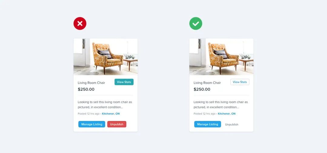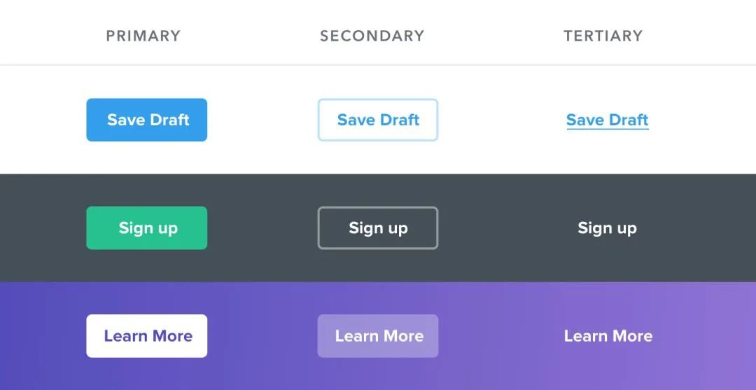 的确,语义和按钮本身的设计息息相关,但是还有更重要的维度被忽略了,那就是层次结构。网页上每个操作其实都位于整个交互金字塔的某个位置。绝大多数的页面其实只有一个主要操作,搭配一些不太重要的次要操作,以及为数不多的几个三级操作。在设计这些交互的时候,通过层次结构来呈现这些交互的重要性是很重要的设计环节。主要操作应该很明显。采用实色、高对比度的按钮是很有必要的。次要操作应该明显,但是不突出,采用幽灵按钮或者和背景对比度较低的色彩是比较合理的。三级操作应该是可被发现,但是不明显的,他们最好被设计为链接。