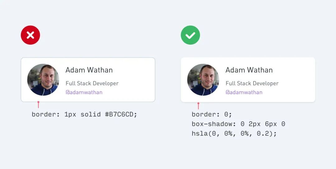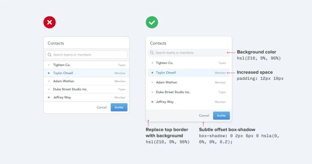 虽然 边框设计是分隔两个元素的好办法,但是它不是唯一的方法,使用过多会让整个布局的设计感降低,甚至会造成混乱。我们可以通过以下几个方法来划分元素的视觉层次,让画面变得干净,整齐:阴影同样可以营造出边界感,而且更加微妙,并不会显得突兀,不会分散用户的注意力。
