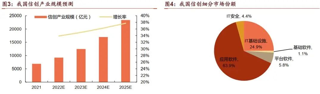 该政策不仅确立了替代工作的具体时间表和实施路径,还详细划分了替代的具体范围。它涵盖了从全面更换的办公自动化(OA)、门户网站、电子邮件等系统,到按需更换的战略决策、企业资源规划(ERP)等经营管理类系统,以及根据能力进行更换的生产制造和研发系统,为信创产业的成长提供了明确的方向。2025年,成为该政策实施过程中的关键时期。按照既定规划,信创替代将在此年份全面启动,届时将迎来招标和项目实施的高峰。这不仅是对前期试点和推广成果的总结与提升,也是对信创产业综合实力的一次重要检验。在2025年能否顺利实现既定目标,将直接影响到信创产业在未来几年内是否能够持续其快速发展的势头。二、市场潜力:万亿规模的信创蓝海