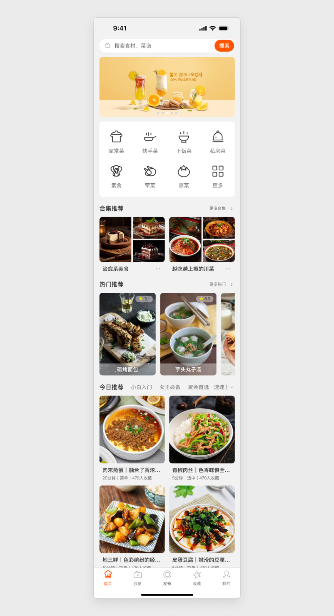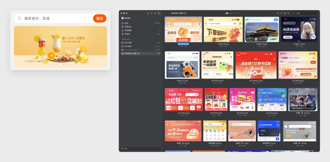 接下来是很关键的一步,就是找参考,但大多数新手其实压根不知道应该怎么找。参考不是根据应用的页面类型去网上四处乱找,比如这个菜谱的首页,你就专门挑同类的应用首页去找。一方面这类应用和案例数量少,另一方面做得好的就更少。真正找参考的方式,是根据组件的类型去找,而不是页面类型。且每个组件单独收集灵感案例,收集的标准一方面是质量比较优秀,另一方面是要觉得这个组件是可以套进原有设计中的,而不是完全没有抄的空间。比如首页顶部栏和广告区域,可以找出若干的案例,然后放进本地的文件夹,或者类似花瓣 Eagle 中的画板里,这个收集过程不要太长,最多收集个20-30个案例即可,再多也没用: