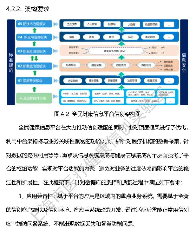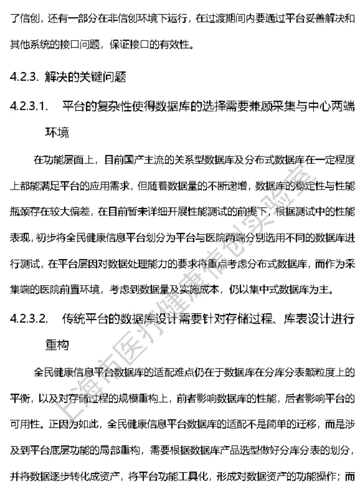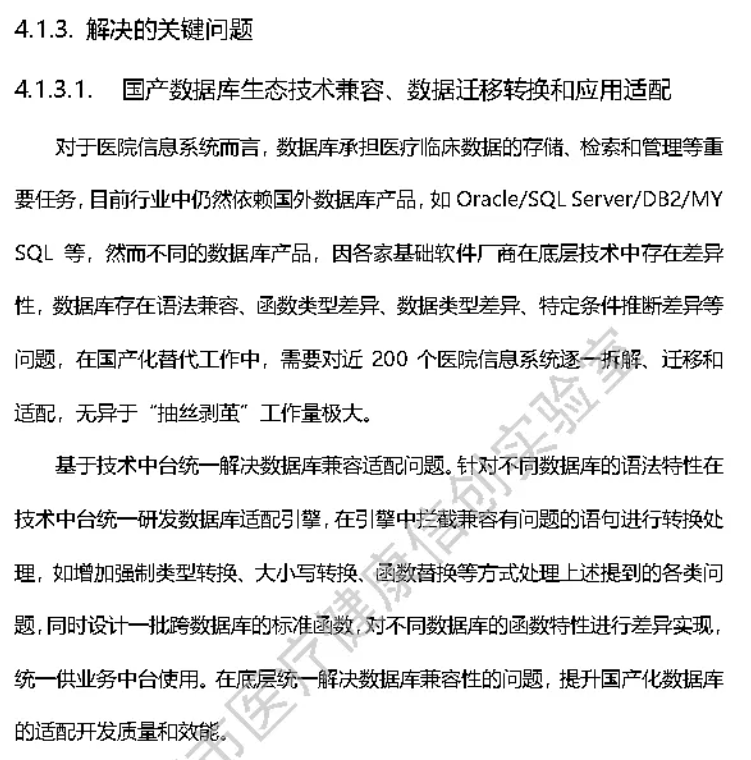 在目前环境下,信创工作的推进对于不同层级的用户而言,有着不同的责任与目标,针对底层基础资源的适配、针对系统软件的适配以及针对业务系统的适配会随着信创工作开展的深度而形成不同的推进策略,有的是需要各卫生健康单位统筹考虑,有的是在更高层级集中解决底层基础资源问题,各卫生健康单位只需考虑在给定的资源组合下,如何对系统软件提出需求,如何组织对业务系统进行有步骤的改造,整体工作中,针对数据库的适配显得尤为关键,是保障系统运行稳定性、可靠性,并决定后续信创推进策略的基础,因此信创实验室优先考虑以数据库为突破口,形成对既有主流国产数据库在公立医院信息系统、全民健康信息平台这两大核心产品体系中适配的测试结果,综合信创整体技术生态对信创工作的开展进行指导。