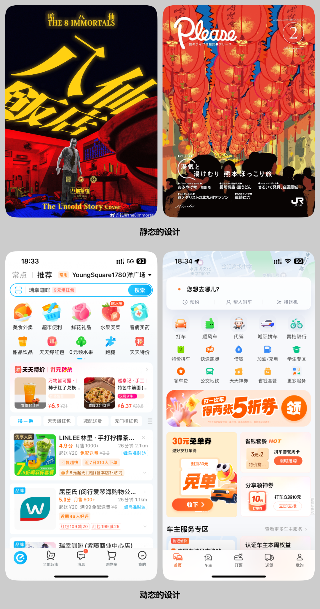 第一点,也是最重要的一点,就是平面设计的对象是“静止”的,在设计被制作出来后就被固定。而 UI 设计的对象是 “动态” 的,不管是内容还是界面本身都会经常发生修改变化。静态的设计稳定,就意味着设计意图可以贯彻,个性化易于塑造。而动态的设计意味不确定性,上线后内容的变更或产品迭代会直接破坏原有的设计,导致设计意图的流产。
