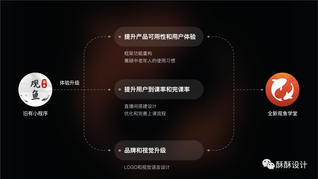 为什么需要进行全面升级改版?主要有两方面原因:一、战略层和范围层发生变化;二、体验层(结构层、框架层、表现层)待优化。随着业务模式跑通,考虑持续拓科,原来的MVP产品难以满足业务和用户的多元化场景和需求;MVP阶段未搭建直播间,而是采用微信第三方,有很多不可控因素,也没办法针对设计,不能很好的满足书画等直播学习场景;产品上课链路不完整,从领课体验到直播上课,再到提交作业,产品上并没有形成闭环,严重影响用户体验,到课率和完课率较低,仍有非常大的提升空间。MVP阶段产品功能单一,只是纯上课工具,没有温度,用户上完课不会多停留;提交作业和作业点评都是在微信班级群内进行,非常不方便,收听点评不及时,容易错过信息,点评效率也很低,并且用户的学习历程无法记录;MVP产品以“国画”为切入点,所以国画风格明显,不适用于不同科目场景,比如作为书法学员打开进入,一股浓浓的国画风格还是挺让人疑惑的;整体缺乏品牌感和统一的视觉语言,信息层级区分不明显,不易识别。经过一段时间的运营,当前已有MVP产品【观鱼书画小程序】,以国画为切入,已有国画、书法、篆刻等科目,并计划持续拓科。MVP模式验证成功后,急需建立核心竞争力,巩固差异化的产品定位;明确产品定位为“以书画为主,帮助有兴趣的人轻松入门到系统学习的专业在线学习平台”。北极星指标是提升转化率,同时降低投放成本,继续拆分目标:因此,当前阶段产品目标为提升体验用户和付费用户的到课率和完课率。通过对主要目标用户进行定量+定性调研,挖掘了解付费用户的使用习惯和痛点;体验用户为什么没有到课和完课的真正原因。通过对业务的了解,明确当前的产品目标为提升体验用户和付费用户的到课率和完课率;通过对用户的调研分析,了解用户目标为轻松快速入门,获取系统专业的技法知识,学有所乐,坚持学习;从而二者结合,确立设计目标:主要为3个大方向,1、提升产品可用性和用户体验;2、提升用户到课率和完课率;3、品牌和视觉升级。