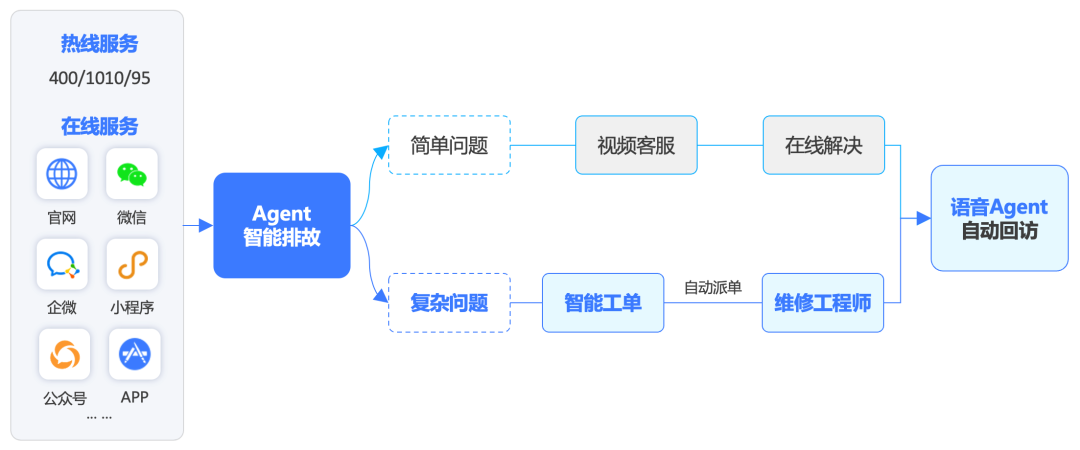 深刻理解客户需求后,天润融通依托全周期客户联络云平台,结合智能工单、在线客服、视频客服等产品,为其打造了一套智能化的售后服务系统。