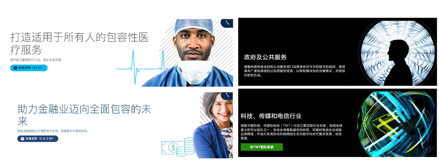 德勤在政府及公共服务强调经验,面向科技传媒和电信行业传达专业及口碑,主要建立协助与陪伴的品牌形象。