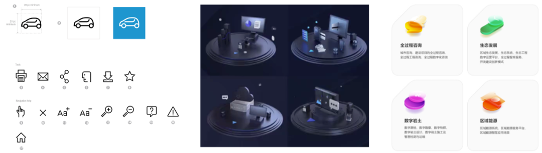 包括图标的设计应用,B端产品的应用图标场景相对较少,但在图标的数量反而可能会更多,有些业务非实体形象还需要模拟客观现实做创建,或使用图标去表达不同业务间的关系,因此B端图标更讲究扩展性、关联性。表现形式也更为多样除传统的几何表达形式外,更主流的应用三维与交互动画形式提高美感与交互反馈。
