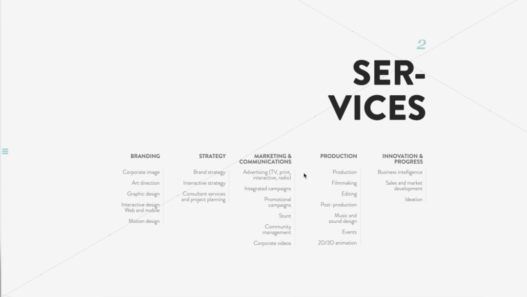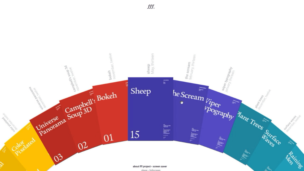 每次定焦一屏的范围显示内容,通过滚轮或按钮上下切屏。基于全屏定焦显示,页面通过覆盖式切换或跳转,甚至鼠标滚轮深入或浅出页面,文中一镜到底的示例便是如此(一镜到底示例位置《24种交互层创意形式->16.一镜到底的视角呈现》)适用于页面模块小而简单的时候,直接将模块在屏幕内一个个展开即可,一屏放不下时可以换行或继续平铺并定焦将内容场景3D化,通常导航或部分UI控件会屏幕上固定,然后可以采取定向镜头伸缩查看,也可以是环绕中心与自由移动查看内容信息