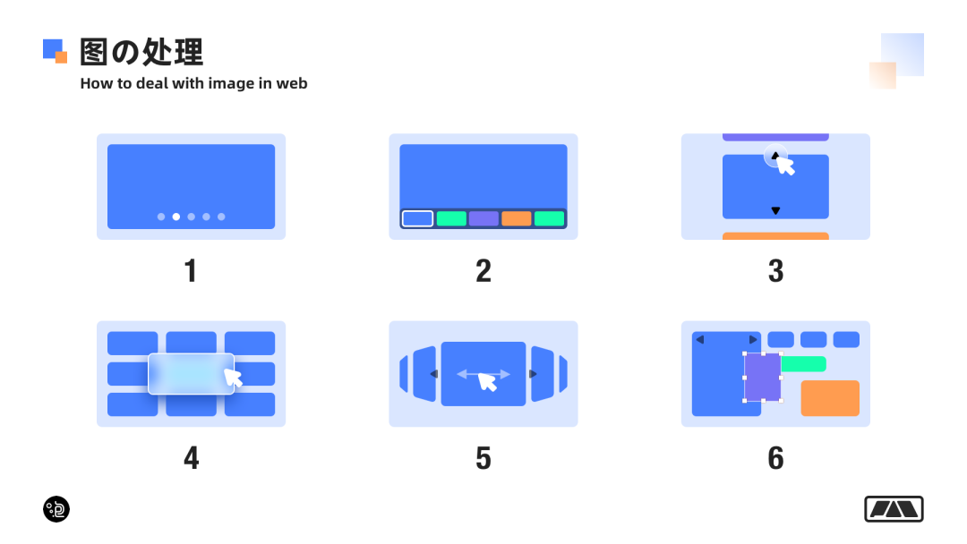 纯图片的形式不多见,但是不能否定,一般可能是图本身有有一定的信息传达,或者是图片浏览类型的服务:• 非全屏图片展示,配合hover状态提示切换,或屏幕上显示切换按钮,适合全屏布局• 图片响应式陈列排放,鼠标悬浮选中时进行聚焦放大• 多张图可陈列摆放或通过大小对比叠加摆放,也以栅格化错位摆放,再适当的配合切换控件