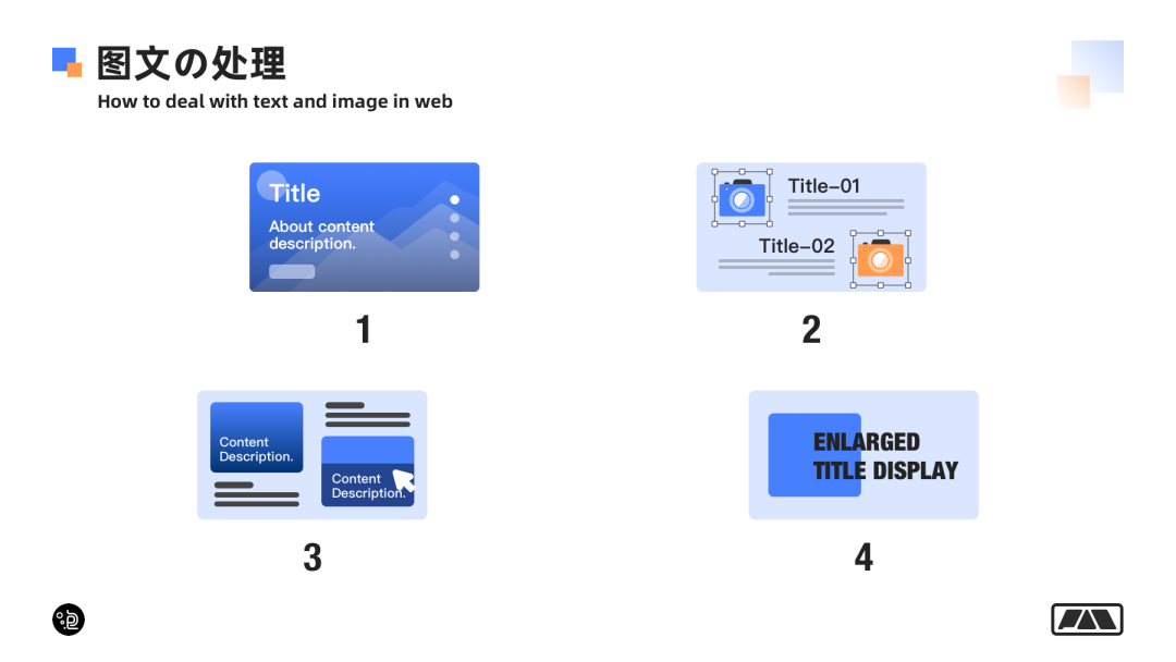 少量图文配套是比较好处理的,手法也比较多,根据配套数量情况还可以调换位置形成错位区分模块:• 大图背景铺满加遮照文案,控件与内容少可采用全屏切换的页面交互• 图片抠图加文案左右排版,注意留白。多组可左右调换位置往下排布,或者使用不同的背景色分割• 图片陈列分割或多个横向排布,文字可以在图上下方摆放或图内加遮照显示,也可以鼠标悬浮聚焦时显示• 小图片配合加大文案叠加显示,突出文字,图片为辅