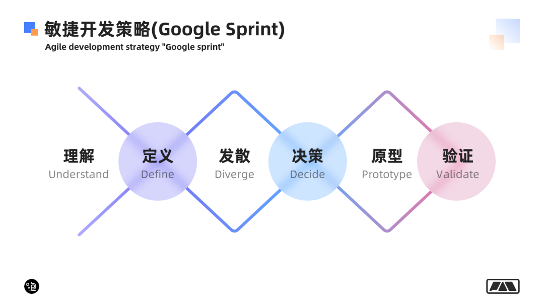 对于想要敏捷实现目标的话,可以采用谷歌冲刺法(Google Sprint),当前基本分为六个阶段进行,分析理解阶段、定义阶段、发散思考阶段、决策阶段、原型产出阶段、测试验收阶段。这里我结合交互创新的方法,对多个阶段进行了补充,内容如下: