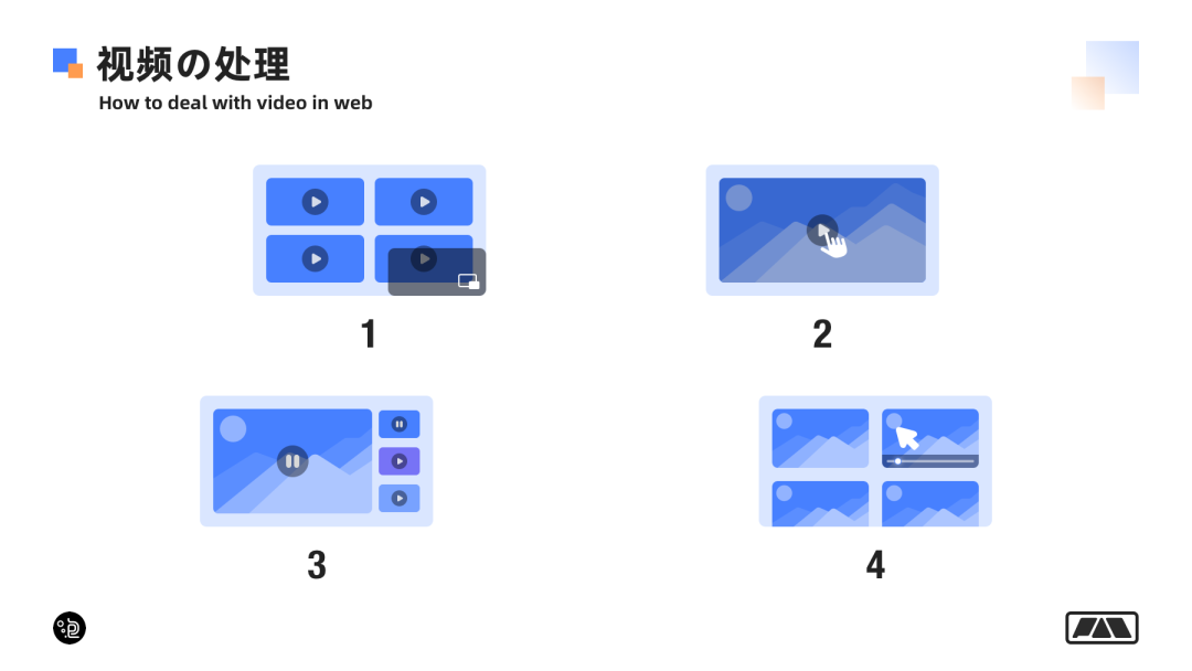 视频的处理分为自动跟手动控制,自动即作为背景自动播放,可进行简单的切换,手动则要注意相关按钮布局和显示遮挡问题:• 视频封面配合播放按钮做入口,不用直接播放,入口可以更小数量更多,点击后画中画或全屏播放都行• 设定好视频播放的大小或位置,给予封面以及播放按钮提示,或者鼠标移入范围显示播放按钮• 单个模块的多视频交互最好给予切换按钮,或者加以带缩略封面的切换栏进行处理,以减少视频模块的占比• 在能够保证内容播放清晰的情况下可以多个陈列摆放,鼠标移入目标时可以直接播放达到视频预览效果