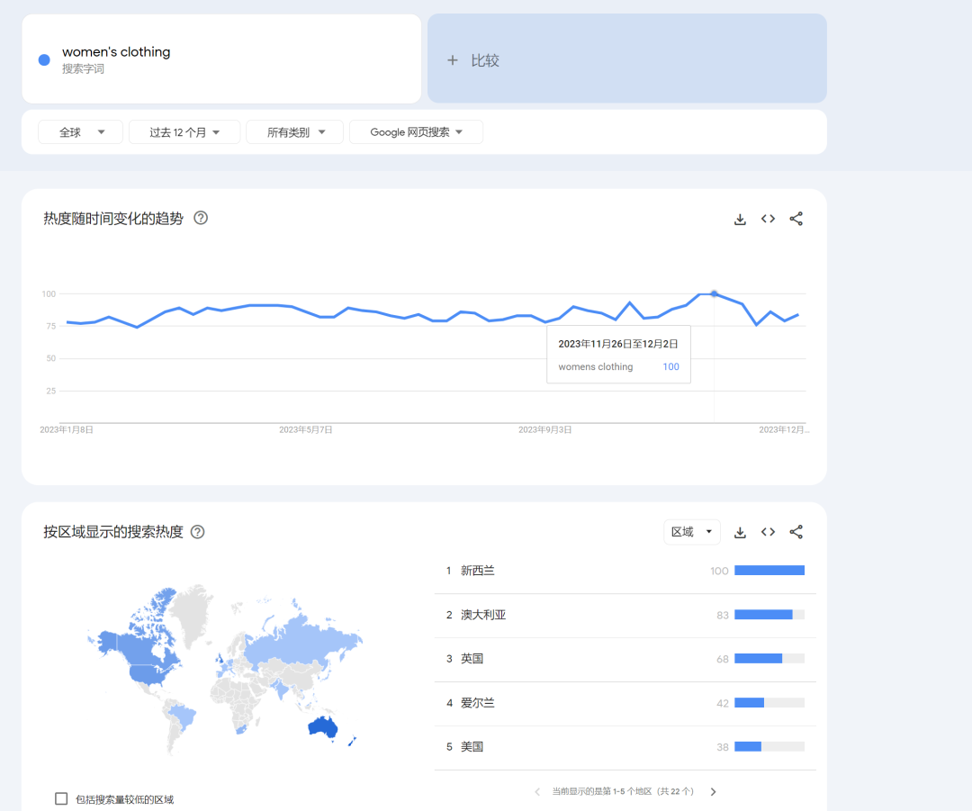 提起外贸独立站总离不开SEO话题,毕竟这是目前成本最低的获客方式,那么如果利用搜索引擎优化来获客呢?接着往下看: 关键词研究 进行深入的关键词研究,找出与您的产品、服务和目标市场相关的关键词。这些关键词应该具有较高的搜索量和较低的竞争度。 如下图所示吗,这是女装“women's clothing”关键词在谷歌搜索引擎的相关数据分析,从中可以得出: 全球近12个月热度趋于稳定; 搜索热度排行前五的国家:新西兰、澳大利亚、英国、爱尔兰、美国;可作为出口地区一个参考依据。