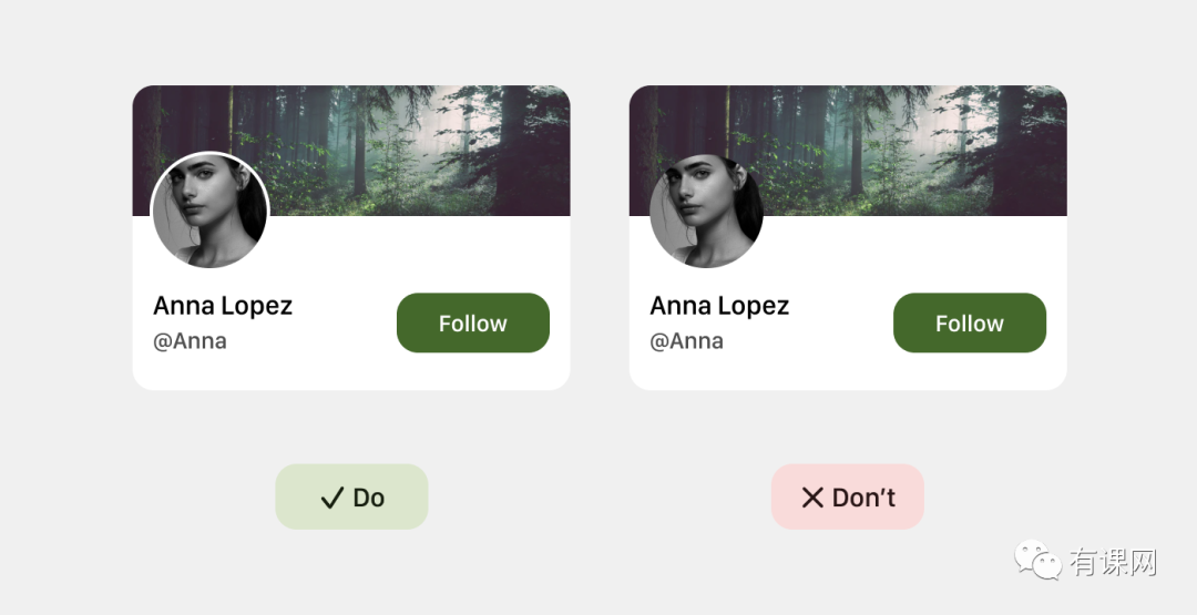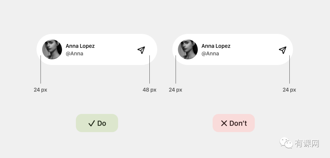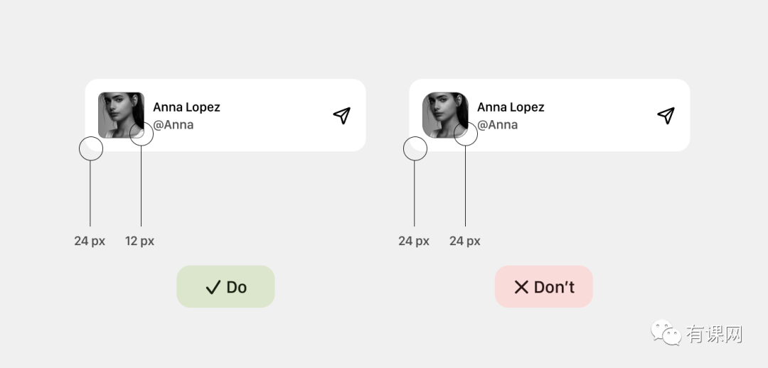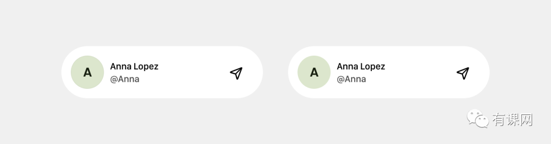 当您在形状上使用具有圆角的元素(也具有圆角)时,请在较大的形状上使用两倍大的圆角半径。例如,我为头像容器使用了 12px 的圆角半径,为卡片使用了 24px 的圆角半径。