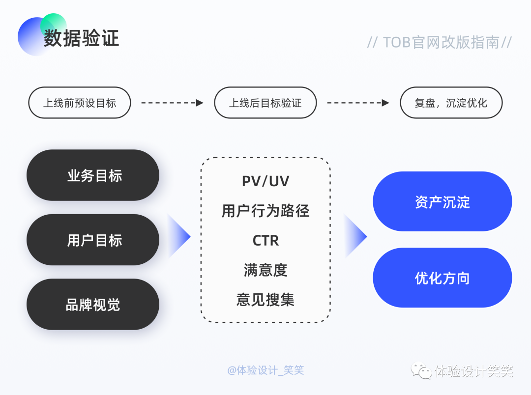 在团队合力完成官网项目的改版上线之后,除了关注改版的业务目标、设计目标是否达到预期,还应该注意搜集线上的数据,与改版前的用户行为路径,PV/UV、停留时长、点击率等多方面对比,看数据上是否与预期的设计有出入,并针对问题分析原因,给出优化方案作为下次优化的依据。