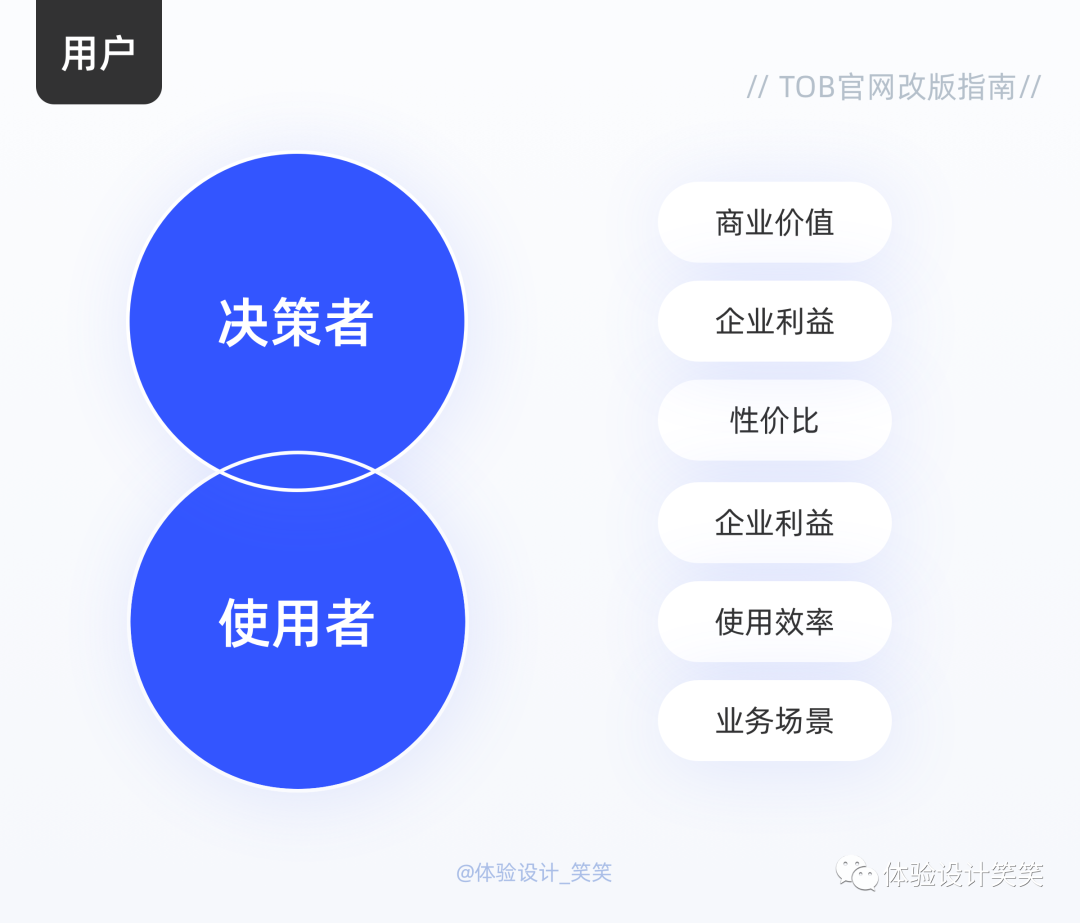 相较于C端的单一类型用户,B端的用户类型比较丰富,也更垂直,不同类型的用户看产品的视角和目标完全不同。在官网产品的改版项目中,我们将B端用户类型划分为决策者和使用者,来辅助我们确定用户层。