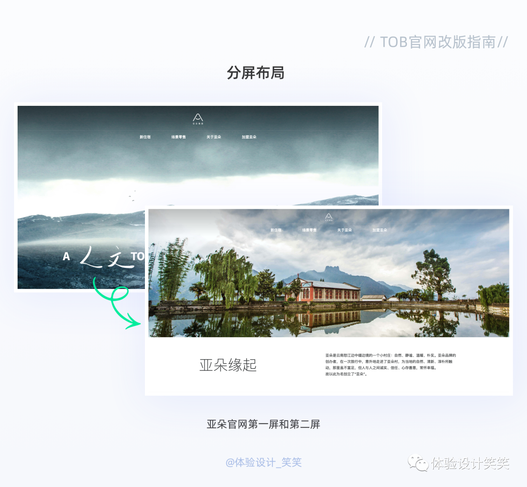 分屏布局的特点是一屏只展示一个重点信息,翻页时自动切换一屏,适合多个同等权重信息的展示。常见的应用场景有奢侈品、电子产品、酒店民宿类的官网。这种布局样式的优点是信息非常聚焦,一屏诠释一个重点,让用户沉浸式浏览,弊端也是很明显的,单屏的信息密度太低,想要展示更多信息需要用户主动下拉切换,同时这类布局没有普适性,仅限某些特定行业和为了达到某些品牌定位和风格。