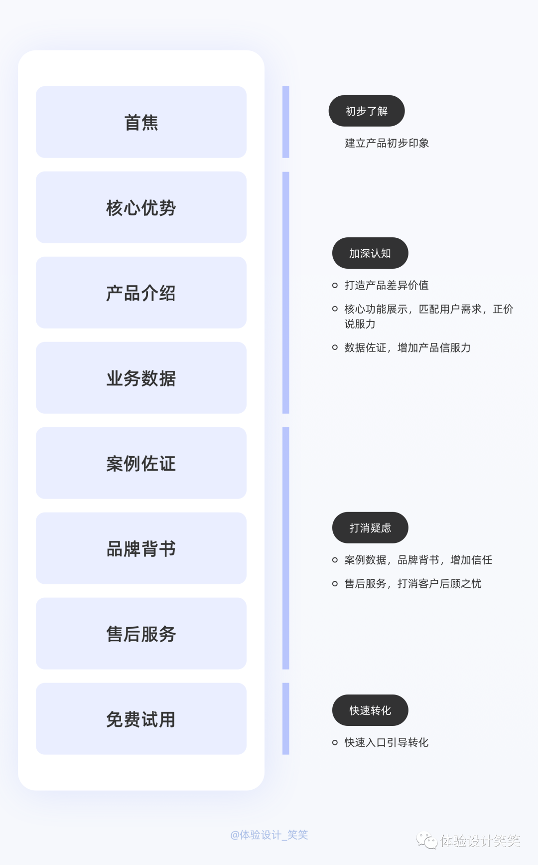 首焦——通常展示企业的产品/服务,给来访者一个初步印象,核心业务——展示企业的核心价值,差异化竞争力优势,同下一版块的产品介绍,给用户一个加深的印象,产品的详细的功能、应用场景的展示让用户更了解产品,做出心理预期,是否满足了用户诉求。紧接着用业务数据,案例佐证,售后服务,品牌背书这些版块一步步,循序渐进让用户打消疑虑,加深对产品的信任,产生购买欲望,这时候,再及时给予留资入口,进而达到转化目的。