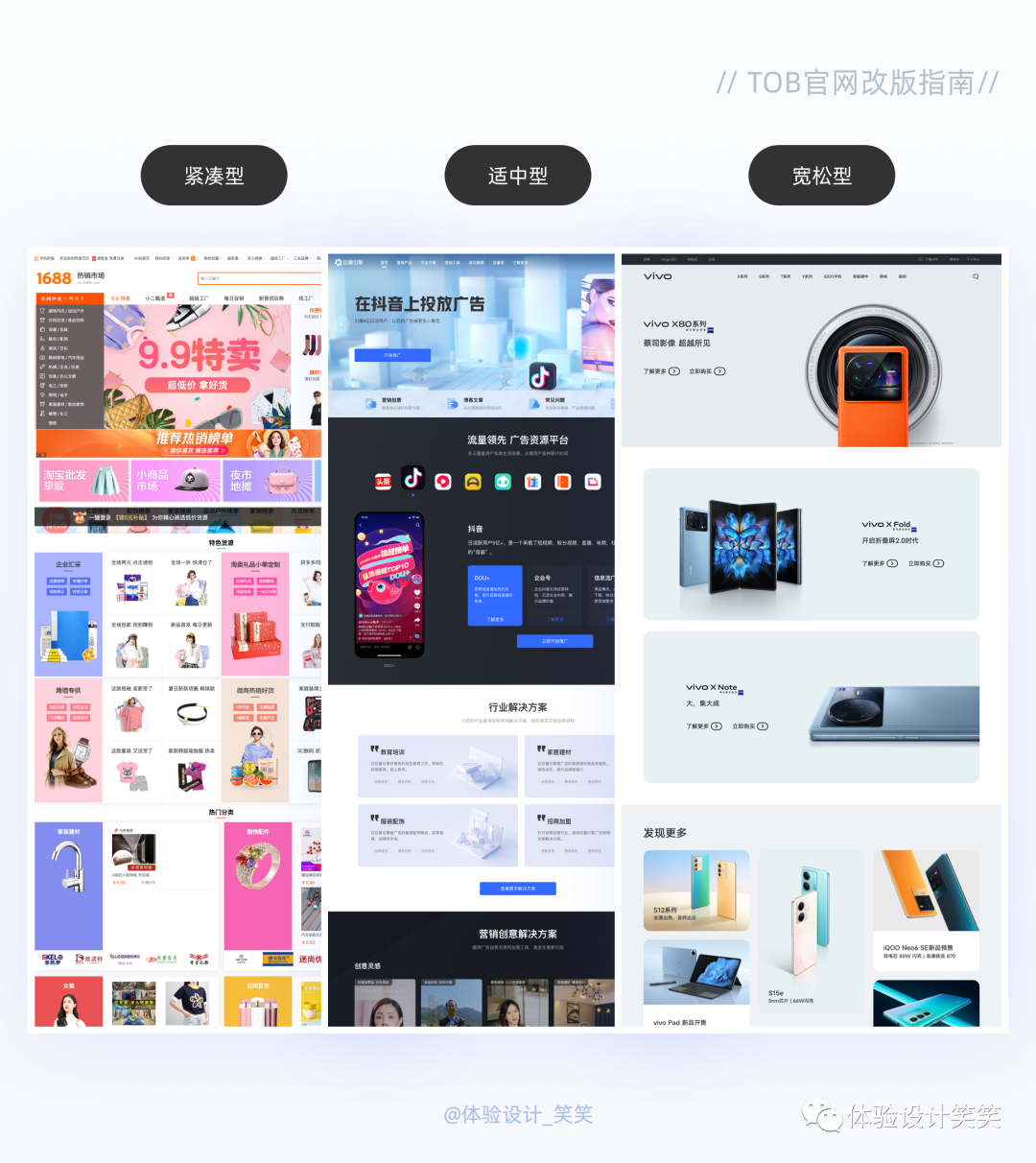 紧凑、适中和宽松的内容排版,在同样的屏幕尺寸内展示的信息量是递增的,恰当的信息密度,展示不同的信息差异化,比如门户网站,电商类的首页作为一个平台,业务的诉求应该是在有限的空间内给最多的商家曝光,给用户最大化的浏览效率,最快定位到目标入口,快速进行流量分发,那么可以采用紧凑型的内容密度。而大部分的企业官网是展示自己的核心产品和服务,没有那么多的信息量需要占据首屏,因此适中的内容密度适用于大多的企业官网。那宽松的内容密度适合什么样的企业呢?当企业以宣传品牌影响力为官网主要目标,首页的信息量比较少,想要突出品牌调性,这时,以大量的图片、场景为元素,诠释公司的品牌理念,给用户有沉浸式的体验。比如电子产品的官网,奢侈品行业,简约风的家居品类,民宿、酒店产业等等。