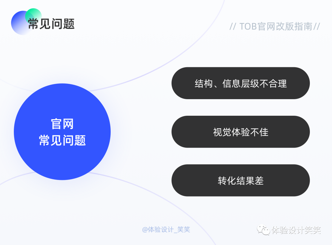 在我们着手改版前,对当前线上官网的问题梳理一下,确定目前存在的问题,才可以知道如何针对性的去改版优化。通常会有以下几个典型的问题: