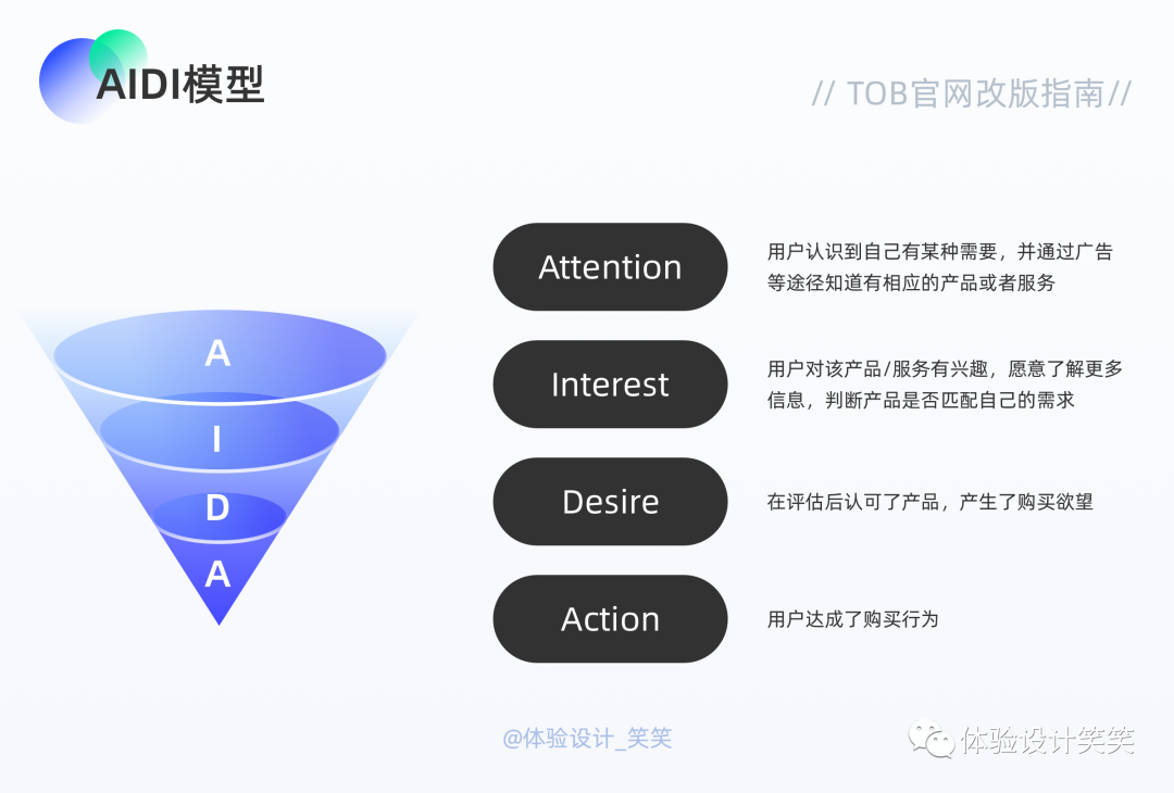 官网的首页至关重要,是访客进入的第一个页面,内容上信息精准并高效传达给用户,说白了就是放什么和怎么放,要有清晰的叙事逻辑,这里我们借助营销中的AIDA模型,构建官网的页面版块搭建: