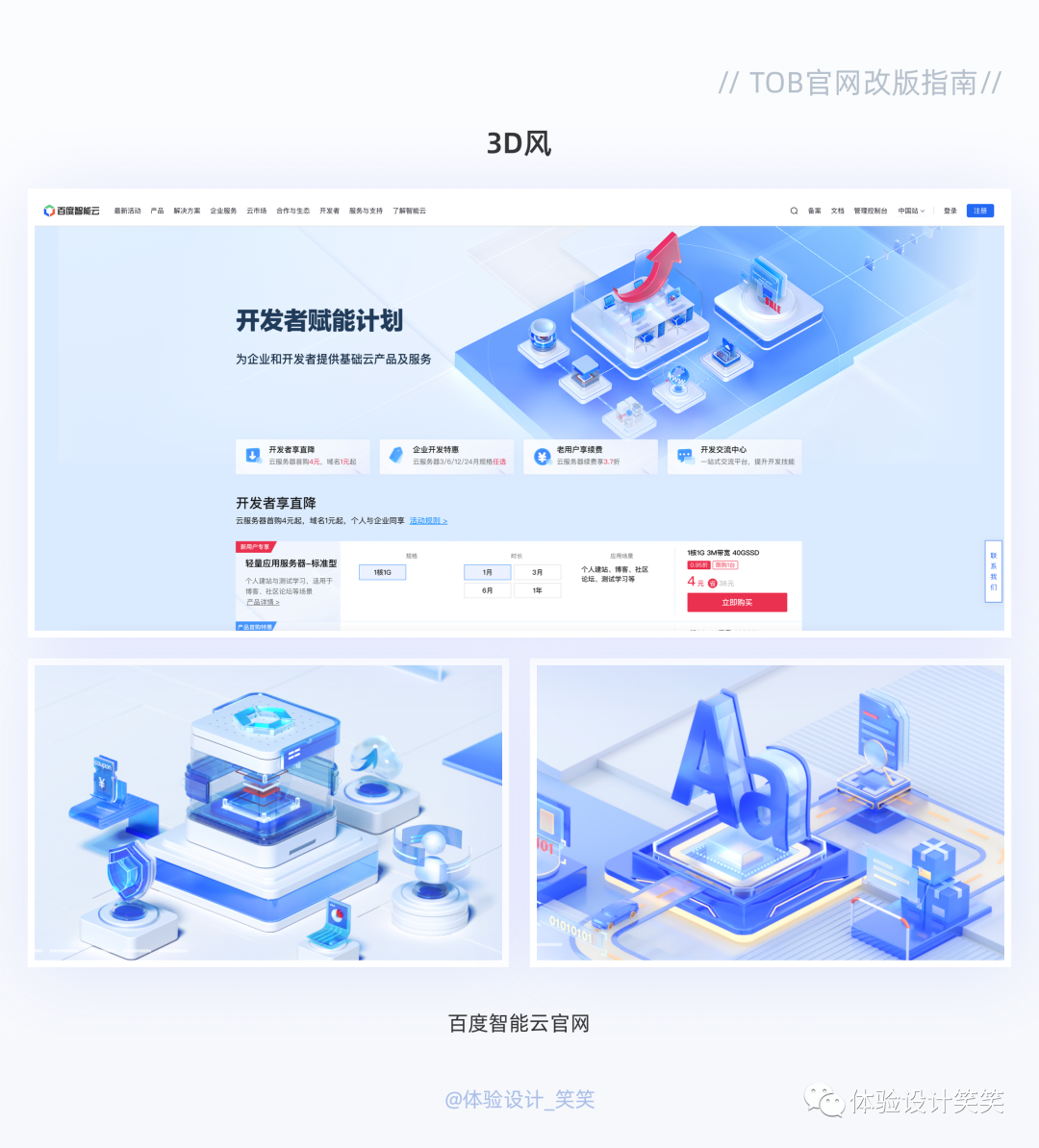 官网的设计语言构建,品牌定位、风格是用户对企业、产品最直接的印象,TO B的企业官网通过页面的风格体现产品的定位,传递专业度、信任感。同时,随着互联网设计的发展,也出现了更多的表现形式,比如3d风、轻质感,还有实时渲染互动的交互,让用户更容易理解业务场景,加深认知。