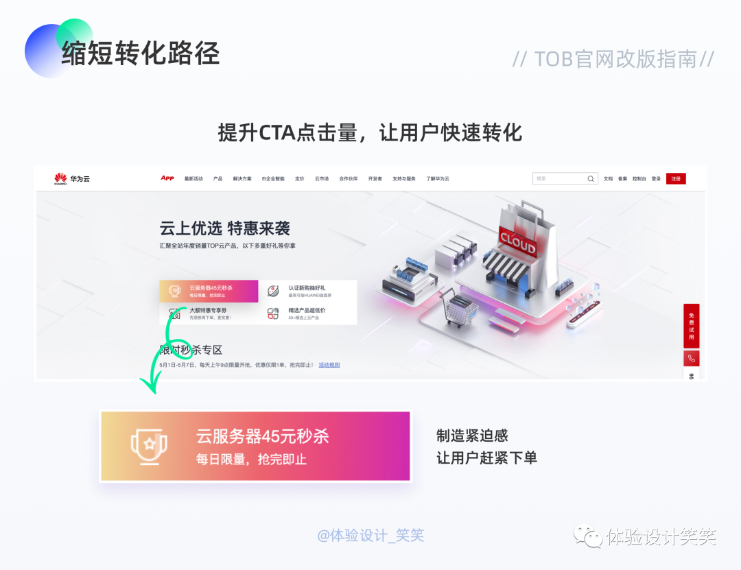 在成功引起用户的兴趣,想要在该节点做出行动时,要看时机适时“收网”,有几种方式引导用户快速转化:(1)设置即时行为召唤按钮,比如首焦banner上的产品试用按钮,页面右侧悬浮的客服联系入口,首屏吸底的留资快速入口等等。这里在文案上可以有一点“小心机”,让用户更多的点击CTA按钮,比如创造一种稀缺感,人们在面对稀缺性资源的时候都会有一种紧迫感,让用户想要赶紧先占位,快速做决定。