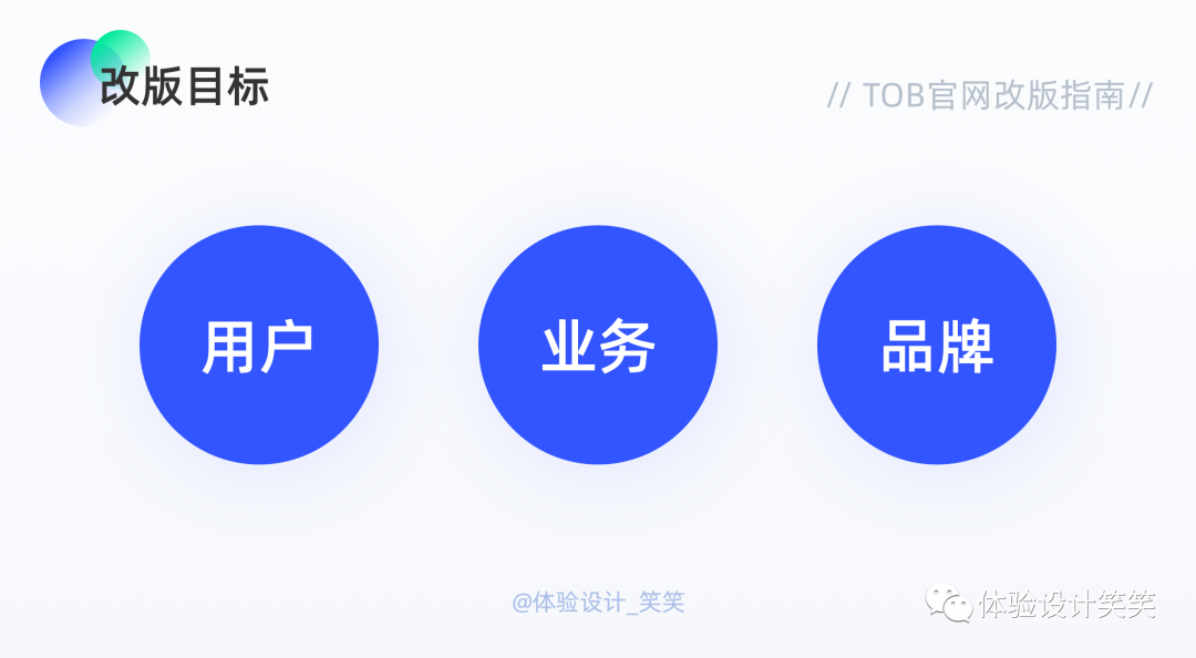 改版迭代类的项目,核心是要明确改版的动机,现状如何,解决什么问题,以及最终要达成改版的目标是什么。脱离商业目标的改版是没有意义的,B端的商业目标通常是提高企业收入、提升业务效率、降低运营成本等。企业官网是潜在客户了解企业、了解产品和服务、联系企业的媒介,如何让客户通过官网提升业务的转化,是官网改版最核心的目标。这里我们可以从用户、业务和品牌视觉层面来拆分目标。