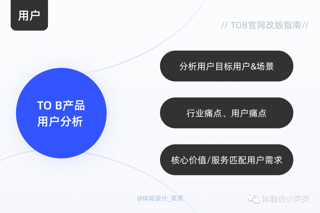 区别于C端产品的界面体验,TO B产品更重服务体验,所以用户层的目标就是围绕产品提供什么服务,给用户解决什么问题,比如:产品核心功能介绍,用户使用产品的场景,产品如何解决行业痛点,用户痛点,产品的价格是否具有竞争力,产品提供的服务和支持是否全面,解决了用户的需求,等等。