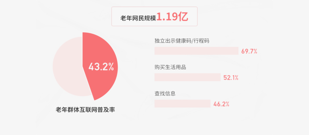 国家制定了一系列针对老年人的政策和引导措施,如《国家老年政策》和《老龄事业发展规划(2021-2025年)》,鼓励企业采用包容性设计原则,为老年人提供更友好、更易用的产品和服务。同时,我国《老年人权益保障法》第2条规定凡年满60周岁的中华人民共和国公民都属于老年人,而适老化的设计针对的就是60岁以上的老人。另外,根据截至2021年12月的报告调查数据,中国60岁及以上老年网民数量已达1.19亿人,互联网普及率已达43.2%,老年人占了相当大的比重。