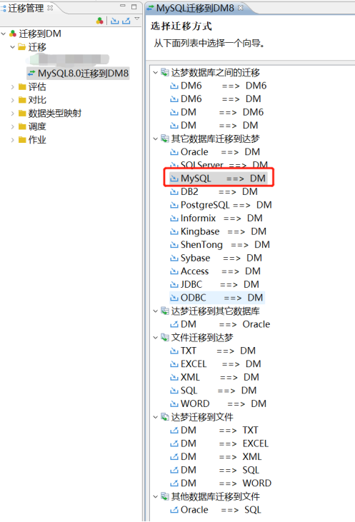 在“其它数据库迁移到达梦”选项中选择迁移方式为 “MySQL ==> DM”。