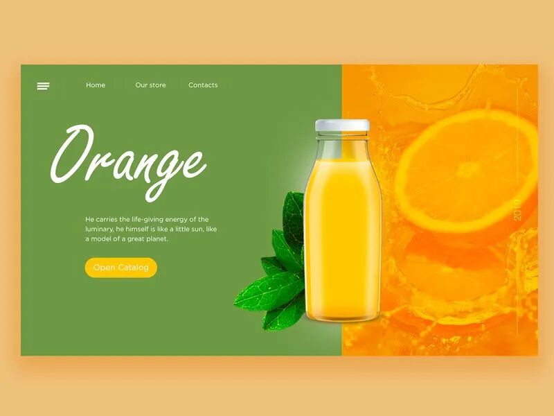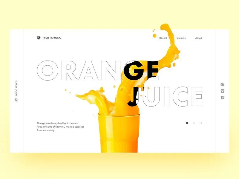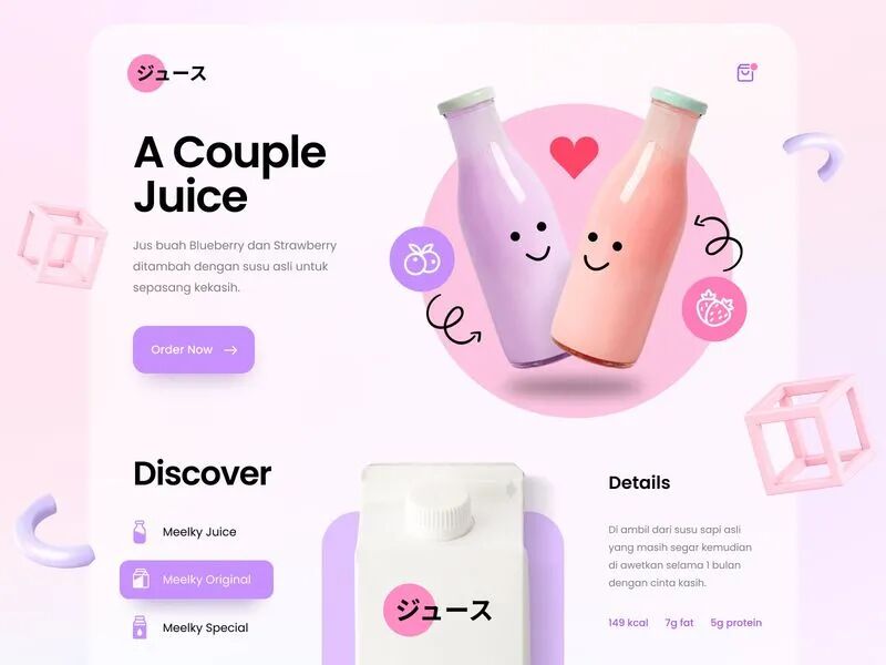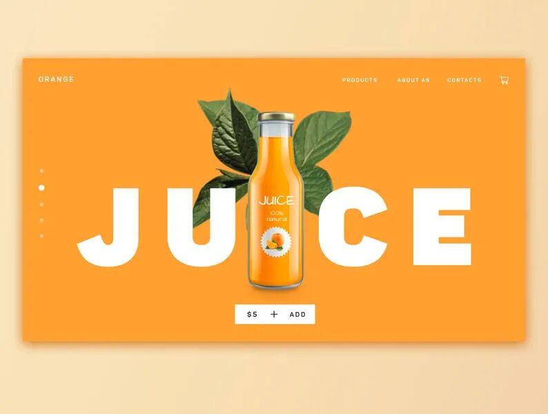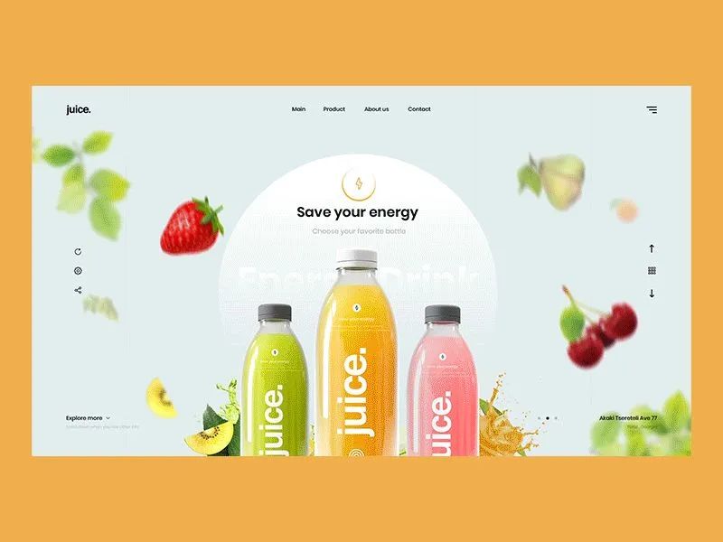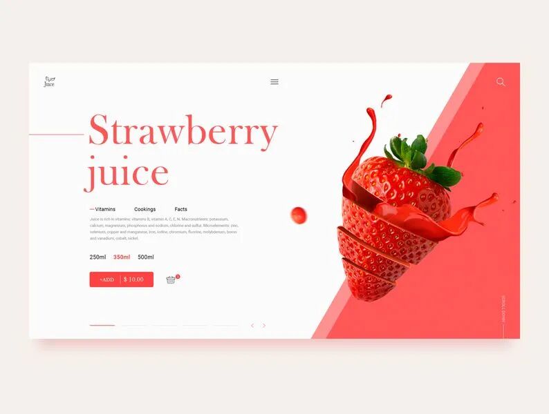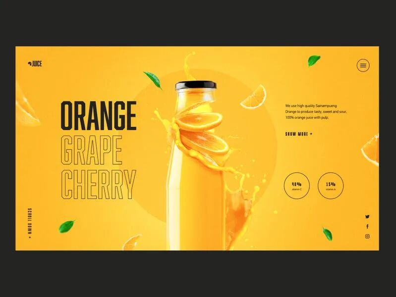 果汁饮料类的网页设计需要展现出食物的美味,运用明亮鲜艳的颜色作为主色调可以很好的将这一特质表现出来!